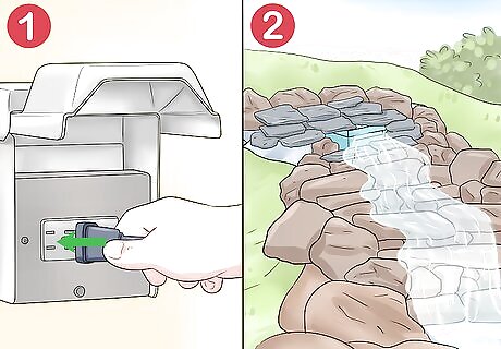 Turn on the power for the pump and check that the water is flowing correctly. When the water begins running clear, move the pump over to the start of the waterfall and turn off the water from the garden hose. Make the pump less conspicuous by covering it with gravel or burying it in foliage.