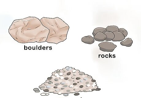 Get your boulders, rocks, and gravel. Generally, waterfalls contain three different sizes of stone: boulders, or larger stones, which frame the waterfall(s); rocks, or medium-sized stone, which serve as the connecting stones; and gravel, which fills in the bottom of the stream and in between cracks and crevasses. Visit a "rock," "quarry," or "gravel and stone" dealer in person to get a feel for what kinds of stones your waterfall might enjoy. This is a much more reliable way of getting exactly what you want, as opposed to merely ordering a kit and hoping that the stones are ones that will look good in your backyard. Here's what you can expect to order when it comes time to buying stones for your waterfall: 1.5 - 2 tons of large (12 - 24 inches) boulders for upper pool and lower basin, plus 2 - 6 tons extra for 10 feet (3.0 m) portions of stream that are above ground .75 ton of medium (6 - 24 inches) rocks per 10 feet (3.0 m) of stream .5 ton of small (.5 - 2 inches) gravel per 10 feet (3.0 m) of stream, plus 1 - 2 tons for the upper pool and lower basin each