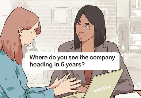 Ask at least 1 follow-up question at the end of the interview. At the end of the interview, the employer will typically ask you if you have any questions for them. Ask things about the culture of the company or what you can expect from working there in the next 6 months. If you had any questions that you wrote down earlier, ask them near the end when the interview is open to discussion. For example, you may ask something like, “What is the career path for someone in this career?” or “Where do you see the company heading in 5 years?”
