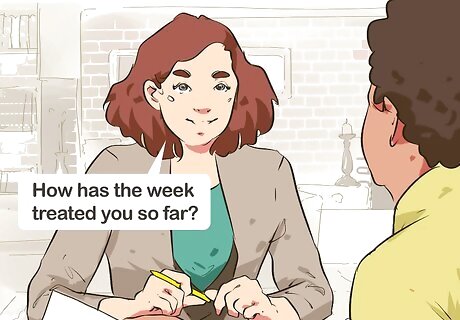 Make small talk at the start of the interview to make a personal connection. When you first start, let the employer know you appreciate the time they're giving you for the interview. As you're settling into the interview, you can ask questions about their day so far or how long they've been with the company to show that you're genuinely interested in them. Follow the interviewer's lead in the conversation, so shift from small talk to job-related questions when they do. For example, you may start off by saying, “How has the week treated you so far?” to interact with them. Small talk works great if you need to walk to a different room for the interview.