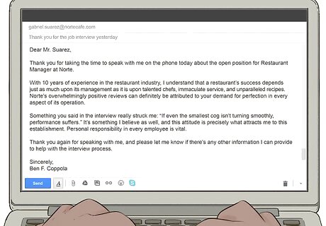 Send the employer a thank you email for the interview. Regardless of how the interview went, follow up with an email to the person you interviewed with and thank them again for their time. Mention something that was brought up in the interview so you can continue the conversation afterward. When the employer gets the email, it will leave a lasting impression on them and may increase your chances at getting called back. You can also send a handwritten thank you note if you'd prefer. If you think of any questions after the interview, you can include them in your thank you email to get clarifications or answers.
