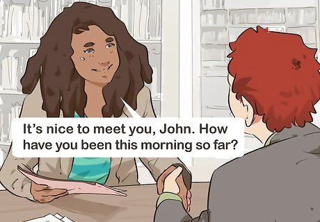 Greet the interviewer and shake their hand. When the employer is ready for the interview, make eye contact with them and smile. Introduce yourself by name, being sure not to interrupt or talk over them. Offer a firm handshake and try not to squeeze too hard or else it will come off as too aggressive. As you shake their hand, you may say, “Hi, I'm Jane Smith. It's a pleasure to meet you.”
