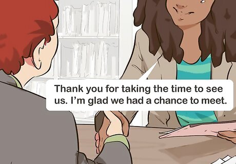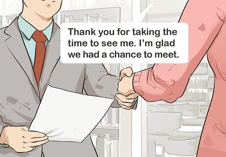 Let the interviewer know that you're grateful for their time. When the interview is over, shake their hand again and say thank you for their consideration. Tell them that you appreciate the time that you've given them and that you hope to hear from them again soon. End on a positive note and smile as you leave so you leave a lasting impression on the interviewer. For example, you may say, “Thank you for taking the time to see me. I'm glad we had a chance to meet.”Tip: Even if the interview doesn't go as well as you hoped, thank them anyway since they could still keep you in consideration for the job.