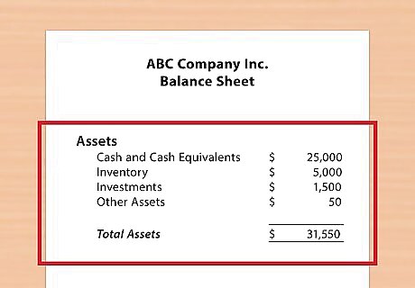 Find the total assets of the company. An asset is defined as anything of value that could be sold or otherwise converted into cash. Total assets, the figure you need for this calculation, will be listed clearly on the company's balance sheet under a list of its parts (like current assets and fixed assets). This figure will also include intangible assets, like patents and goodwill.