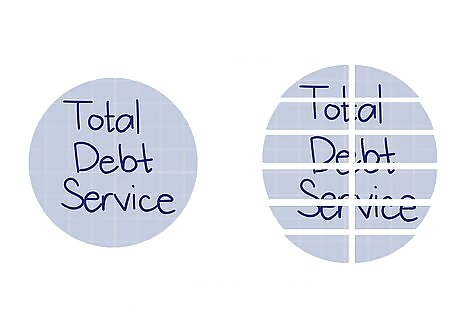 Calculate total monthly debt service payments. Begin by calculating the monthly payment for each of your loans. Total the monthly payments for all of your loans by adding all of the monthly payments together. Once you know your total debt service payments, you can calculate the debt service ratio. For example, suppose in addition to the car loan for $400.76 per month, you have a mortgage payment for $823.45 per month and a student loan payment of $147.89 per month. Your total debt service payments would be $400.76 + $823.45 + $147.89 = $1,372.10.
