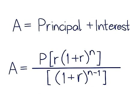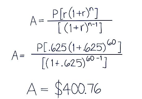 Calculate monthly payments on debt. In most cases, your lender calculates your monthly payments when you are approved for a loan. However, you can calculate the monthly payments yourself. You can search online for a payment calculator or do the equation by hand. To calculate monthly payments on a debt, first calculate the rate per month by dividing the annual interest rate by 12. Then, calculate the monthly payment on each loan using the following formula: A = P [ r ( 1 + r ) n ] / [ ( 1 + r ) n − 1 ] {\displaystyle A=P{[r(1+r)^{n}]/[(1+r)^{n-1}]}} {\displaystyle A=P{[r(1+r)^{n}]/[(1+r)^{n-1}]}}. In this formula, A = amount per month, P = principal (loan amount), r = interest rate per period and n = total number of payments. For example, suppose you purchased a $21,000 car and you put down a $1,000 down payment. You need to borrow $20,000, so you take out a 60-month loan at an annual interest rate of 7.5 percent. Calculate the interest rate per period (month) by dividing 7.5/12 = 0.625 percent per month. Plug in the values to the formula: A = [ .625 ( 1 + .625 ) 60 ] / [ 1 + .625 ) 60 − 1 ] {\displaystyle A={[.625(1+.625)^{60}]/[1+.625)^{60-1}]}} {\displaystyle A={[.625(1+.625)^{60}]/[1+.625)^{60-1}]}}. In this example, the total monthly payment would be $400.76.