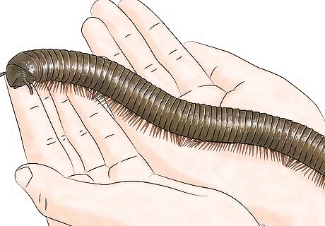 Handle them carefully. You can touch your millipedes, just make sure to be gentle. Pick them up using two hands and hold them lightly. Remember, millipedes can be very long, so you want to support their entire body. Millipedes do not sting or bite. They will not harm you. If you have children, you can teach them to gently hold the millipedes. This will be a great learning experience. Millipedes often curl into a tight ball when scared. If this happens, place them gently back in their home.