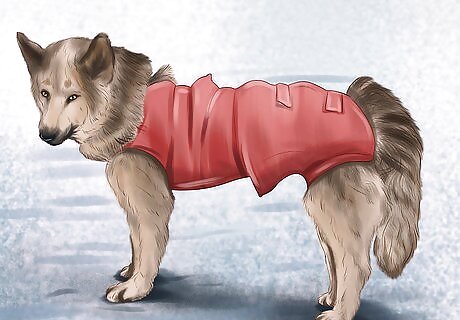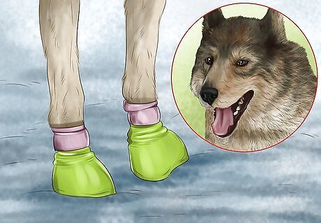 Invest in dog booties. There are several situations where it might be necessary for your dogs to don booties. One is extreme cold. The other is when running in deep snow. Finally, you might also want to outfit your dog in booties if it has injured its paw and you cannot change the dog out for another one. Sled dogs have thick coats and have evolved to thrive in cold weather environments, and can tolerate temperatures as low as -55 degrees Fahrenheit (-48 degrees Celsius). However, sled dogs have their limits. Check your dog’s paws frequently for cracked, bloody pads and put them in boots if you see any of these conditions. Different dogs have different tolerance levels for temperature. The dog’s age and health are the most important factors that determine how cold a dog’s feet can get before the temperature begins to have a negative impact. Different booties are recommended for different terrain. For instance, you could get a bootie that works best on ice, or one that works best on snow. Other booties are designed for off-season practice on dirt or gravel tracks. The booties also come in different sizes. Be sure to buy one that’s right for you and your dogs. Sled dog booties are readily available online, or at certain pet stores.