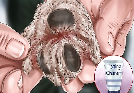 Use healing ointments on your dogs’ paws. There are a variety of oils, liniments, and lotions available to heal damaged paws. Choose one that is right for your dog’s needs. Most ointments simply require massaging the product gently into the dog’s paw. Always use lotions and ointments as directed. Liniments with emu oil are good at limiting inflammation and preventing infection. Emu oil can restore elasticity and nutrients to the skin. Ointments with zinc oxide are excellent for healing fissures and cracks on the dog’s pads and between the toes. Be careful, however, not to let your dog lick the zinc oxide ointment. Ointments made with lanolin and glycerin are useful for preventing ice balling on your dog’s feet and ankles. These ingredients can help keep your dog’s pads and skin healthy.
