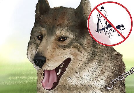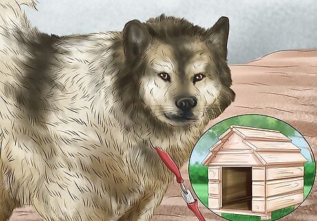 Tether your sled dogs outside. When your dogs are not in the yard, put them in their kennel. The kennel should have a semi-open arrangement that allows each dog to get close enough to its neighbor to play and socialize when tethered, but should also give the dog the option of sitting by itself without possibility of interruption from other dogs. Experiment with the spacing to figure out how long your tether should be and how far apart each dog should be spaced from its neighborhood. Use straw for bedding. Mix some pine shavings into the straw if you’re concerned the kennel is accumulating moisture. Change the bedding every two to three weeks, or when it is visibly dirty. The size of the kennel depends on how many sled dogs you have. Each dog should have at least 35 square feet to itself. Puppies should be kept in the kennel but not tethered. Provide a separate, smaller pen for them to socialize in together.