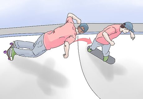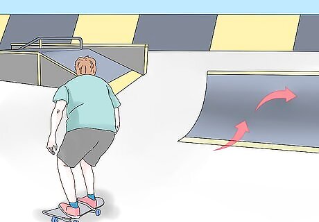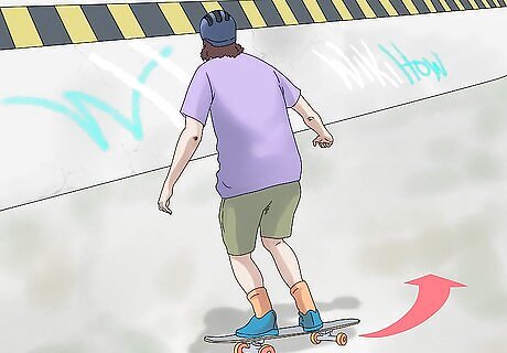 Skate along a transitioned (curved) halfpipe wall. Pick a line that gives you enough space to ride in an arc shape. Roll into the arc at a good speed, and push yourself into the transitioned wall to give yourself a good speed boost. Keep your knees bent and don’t lift your wheels – this will stop the carve by ruining your momentum. If you find you can't travel the entire arc, push into the line with more speed. The speed that you enter the carve with must be enough to hold you to the wall for the duration of your arc. Hold your position until you begin rolling in the opposite direction as the wall. At this point, slowly stand up and return to a neutral position.