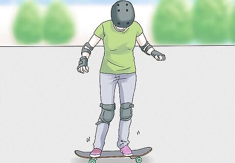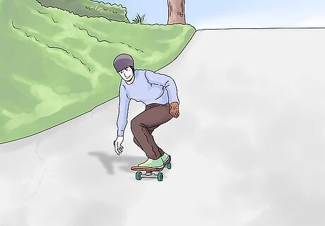 Skate downhill at a moderately fast speed. Bend your knees and keep balance. You can bend down as far as you feel comfortable, even to the point where you are almost sitting on the board. Practice both frontside and backside carves. When you reach the bottom of the hill or want to stop carving, stand up and slow down. You can also use foot-braking, or slide with a pair of specialized gloves.
