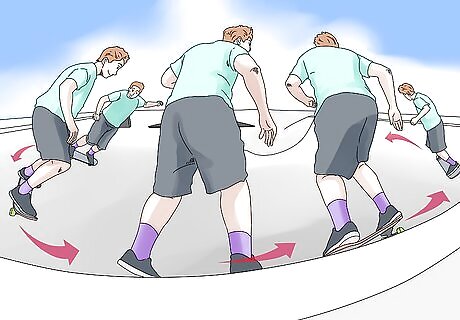 Practice carving long curves. If you want to carve a big curve or long pocket in a bowl, you need to push into it with lots of speed. This is essentially like carving the side of a halfpipe, only for a much longer duration. Give yourself a couple of pushes before hitting your line and keep your knees bent. If you feel yourself falling away from the curve too soon, turn away from the wall, leave your line, and start over. Next time, hit the line with a higher speed. Be patient and keep practicing when carving long curves. If you're having trouble getting and maintaining speed, try approaching your line differently. For example, try hitting your line sooner or later to gauge the best approach.
