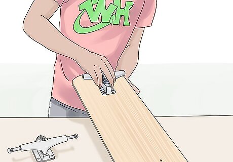 Attach trucks at least 8 inches (20 cm) wide. In general, your truck axle should have a width that is close to the width of your skateboard deck. For 8 to 8.5 inch (20 to 22 cm) skateboard decks, use an 8 inch (20 cm) truck axle. If your deck is between 8.5 to 9 inches (22 to 23 cm), use an 8.5 inch (22 cm) truck axle. If you have a 9 to 10 inch (23 to 25 cm) skateboard deck, a 9 inch (23 cm) truck axle is ideal. If you have a skateboard deck 10 inches (25 cm) wide or more, use a 10 inch (25 cm) truck axle. Medium and high truck profiles (the distance between the bottom of your deck and the triangular hangers that hold your wheels) are best for carving. Keep your trucks loose for easier carving.