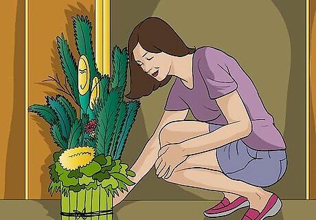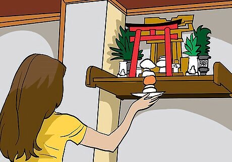 Leave Offerings in front of the kamidana and butsudan. Common offerings are mochi, persimmons, chestnuts, pine seeds, black peas, sardines, herring roe, cuttlefish, and oranges.
