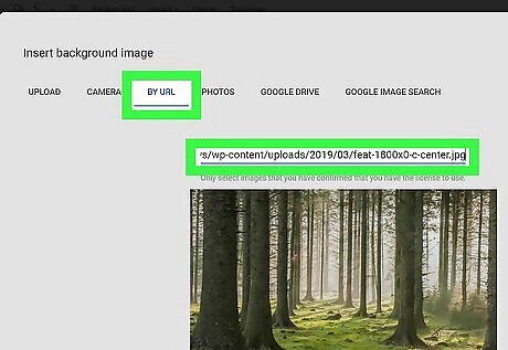 Use an image from another website. Click “By URL” from the left menu panel and paste or type in the web address of the picture you want to use as your background on the text field provided (e.g., www.google.com/your_picture.jpg).