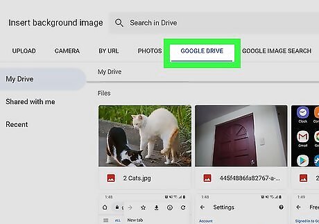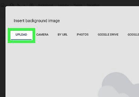 Upload a picture. Select any image saved locally on your computer and drag it across the screen to the main section of the “Insert Background Image” window to upload a picture.