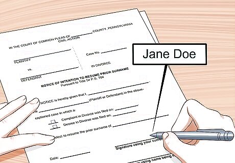 Obtain the required forms. An Election or Notice to Resume Maiden Name form for an adult who wants to change her name after a divorce is generally available in most Prothonotary offices in each county. Filing this form will allow you to change your name from a married surname to a prior surname if you are newly divorced.The Prothonotary’s office will charge a fee to change your name. This fee typically ranges from $19.00 for a person who was divorced in her county of residence, to $42.00 for a person who was divorced in another county or state. However, these fees vary by county.