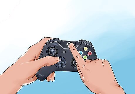 Press the Xbox button to open the guide. The Xbox button is the large silver and black button in the top center of the controller.