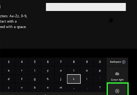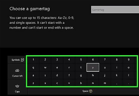 Select Make my own and press A. Enter your desired gamertag into the field. Gamertags must be unique. If the gamertag you enter is already taken by somebody else, you must choose a different gamertag. You can also pick one of the suggested gamertags. Select "More" to see a longer list of options.