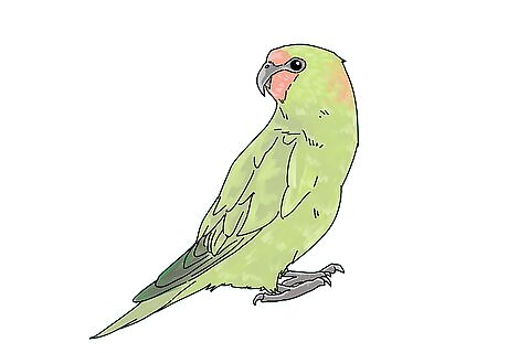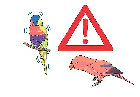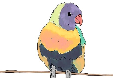 Ensure the bird is healthy. Look for signs of illness, such as respiratory problems like bobbing of the tail as the bird breathes. Make sure the bird’s beak, mouth, eyes, and ears are clear, with no swelling, redness, or discharge. Look for smooth, bright, and colorful feathers rather than torn or tattered feathers or bald patches. Signs of illness may include: Sitting huddled at the bottom of the cage. Trembling. Not preening or taking care of their feathers. Weakness, losing balance, collapsing, or having seizures. Not responding to their owner, changing their behavior, or being inactive. Discharge and/or crusting from the eyes and/or nares (nasal passages). Difficulty breathing and/or sneezing. Overgrown, discolored, or other changes in the beak. Red or bare areas around the bird’s eyes or on other areas of the body. Lameness and/or foot swelling. Flakiness, raw areas, and/or changes in the skin of the bird’s legs and feet. Abnormal nail growth. Injuries to the bird’s feathers, wings, feet, or beak.