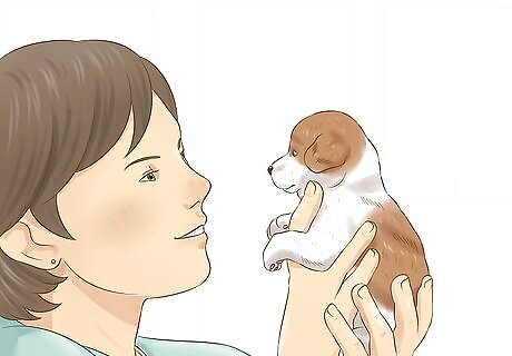 Choose a puppy with a balanced personality. Often, the best pets are the ones that have balanced personalities. You may not want the bossy, strongest puppy who seems to be the leader or the shy runt who gets left behind. Instead, you may want to look for a puppy who falls in the middle of the personality scale. This puppy may be energetic, but also knows how to be calm and mind. You might want to consider: How well does the puppy play with their littermates? Are they rough and assertive, or do they run and hide? Is the puppy very loud and boisterous or soft and quiet? Does the puppy like to be touched and handled?