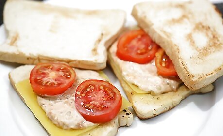 Make a healthy sandwich. Sandwiches are good for you, and adding healthy foods to your sandwiches is even better. Start by choosing whole grain bread; whole grains are healthy choices for your body. Include vegetables such as lettuce, tomatoes, and slices of cucumber. You can also add fruits such as almonds and bananas. Healthy meats are also great options, and those include roasted turkey and beef low in fat.