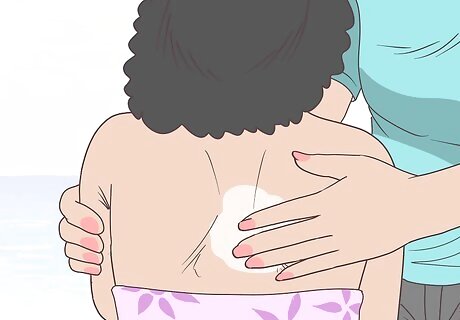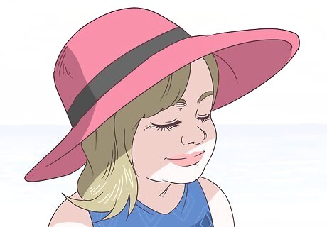 Protect their face and scalp with a floppy hat. Pick a wide-brimmed hat for the best protection. This will cover their scalp and shade their face and neck so that they’re better protected. Let your child help pick out the hat so they’re more likely to wear it. If they’re spending time in the water, you can pick a water-proof hat that’s meant for outdoor fun.Tip: If your child is a baby who’s younger than 6 months old, they really need to wear a hat anytime they’re outdoors.