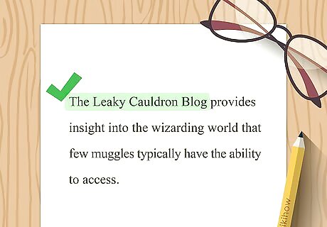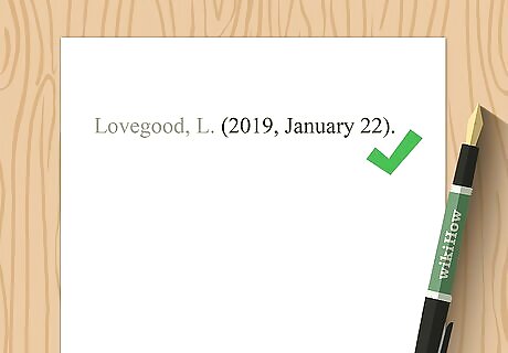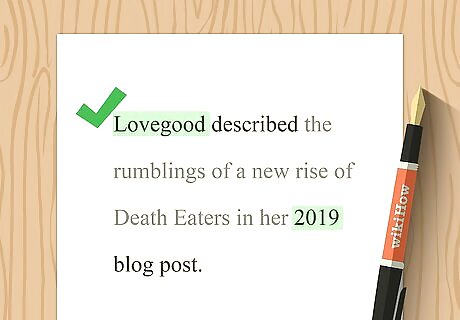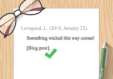 Omit a parenthetical citation if you include the information in your text. APA style recommends that you incorporate citation information into your text wherever possible instead of using parentheticals. This can enhance the readability of your text. For example, you might write "Lovegood described the rumblings of a new rise of Death Eaters in her 2019 blog post." If you include the name of the author in your text but not the year, add a parenthetical with the year immediately after the author's name. Since blogs don't typically have page numbers, there's no need to include that information for direct quotes. APA style doesn't require a paragraph number.