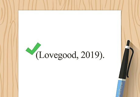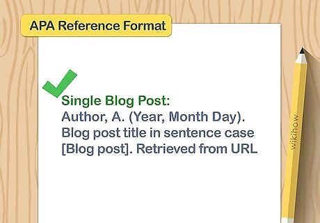 Add the year of publication after the name of the author. After the last name of the author, include the year the blog post was published. There's no need to include the rest of the date as it appears in your Reference List entry. Place the sentence's closing punctuation after the closing parenthesis. Example: (Lovegood, 2019). APA In-Text Citation Format – Single Blog Post (Author, Year).