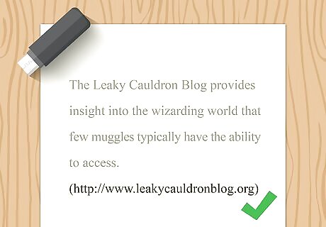 Provide a link to the blog in a parenthetical citation. At the end of the sentence in which you mention the blog, add a parenthetical citation with a link to the blog's home page. Place the sentence's closing punctuation after the closing parenthesis. For example, you might write "The Leaky Cauldron Blog provides insight into the wizarding world that few muggles typically have the ability to access (http://www.leakycauldronblog.org)."