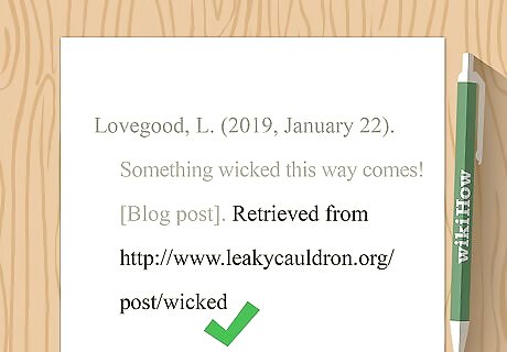 Place the last name of the author in your parenthetical citation. At the end of any sentence in which you paraphrase or quote from the blog post, place a parenthetical that includes the author's last name, followed by a comma. Example: (Lovegood,