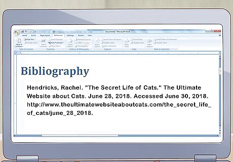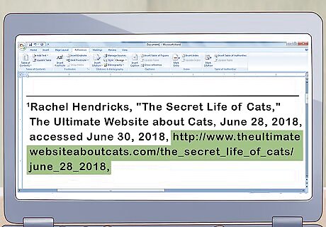Put the URL and a comma next. The URL is the web address where you found the webpage. Include the whole address, along with the "http" at the beginning. Now your citation looks this way: Rachel Hendricks, "The Secret Life of Cats," The Ultimate Website about Cats, June 28, 2018, accessed June 30, 2018, http://www.theultimatewebsiteaboutcats.com/the_secret_life_of_cats/june_28_2018,