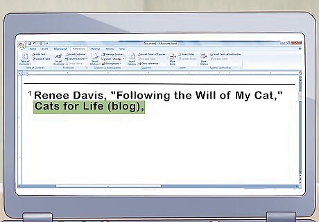Add the title of the website and the medium, as applicable. If you're citing a blog, put the name of the blog in italics followed by "blog" in parentheses. On the other hand, if you're citing a video, you would write "YouTube video" without italics to indicate the medium. For instance, you might write: Renee Davis, "Following the Will of My Cat," Cats for Life (blog), Alternatively, you might write: Renee Davis, "Following the Will of My Cat," YouTube video, If it has a running time, add that, too: Renee Davis, "Following the Will of My Cat," YouTube video, 4:22,