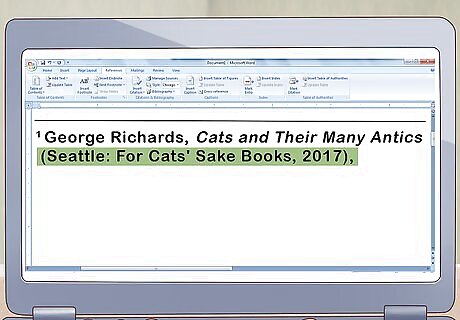 Place the publisher information in parentheses. Start with the publication city, followed by a colon. Put the publisher in next, followed by a comma. Then, add the publication date, the end parenthesis, and a comma. Your citation might look like this: George Richards, Cats and Their Many Antics (Seattle: For Cats' Sake Books, 2017),