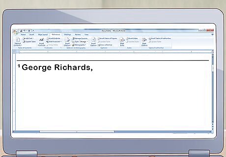 Put the author's name first in your footnote. You essentially cite an electronic book the same way you cite a physical book, though you'll add a media marker at the end to designate the type of publication. However, for now, just start with the author's first and last name, followed by a comma. For example, you might write: George Richards, If the book has multiple authors, put them all in, separated by commas, and an "and": George Richards, Rachel Roberts, and Rebecca Henderson, Place the authors' names in your citation using the same order they appear in on the book.