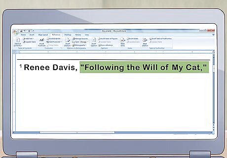 Place the title of the work in quotation marks. Whether it's a blog post or video, the title of the work should go next. The quotation marks indicate it's a short work, like an article, a post, or a video. For example, your citation might look like this: Renee Davis, "Following the Will of My Cat," Use a comma before the last quotation mark.
