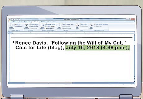 Put the publication date next. If the source has one, include the publication date. You can even include the time if the source gets that specific, but use parentheses for it, followed by a comma. For example, you might write it this way: Renee Davis, "Following the Will of My Cat," Cats for Life (blog), July 16, 2018 (4:38 p.m.),