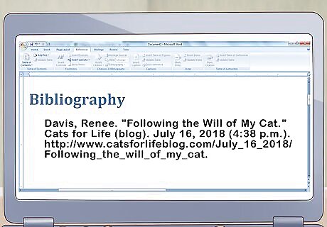 Make your bibliographical entry by changing up your long footnote. Place the author's last name first, so you can alphabetize the entries. Change commas to periods. You don't need the section or page number. A bibliographical citation might look this way: Davis, Renee. "Following the Will of My Cat." Cats for Life (blog). July 16, 2018 (4:38 p.m.). http://www.catsforlifeblog.com/July_16_2018/Following_the_will_of_my_cat.