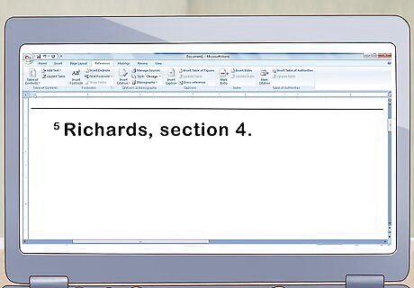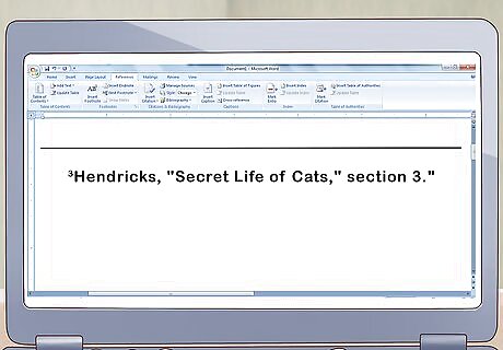 Change your citation to a shortened form after you cite it once. You'll use the long citation as a footnote the first time you cite it. After that, you can use a shortened form with just the author's last name and the section/paragraph/chapter number, if applicable. If you're using more than one work by the same author, add a shortened form of the title. For example, you might write: Hendricks, section 3. If you're using more than one work by the same author, you'd write: Hendricks, "Secret Life of Cats," section 3." If you're using authors with the same last name, use the author's first name, too: Hendricks, Rachel, section 3.