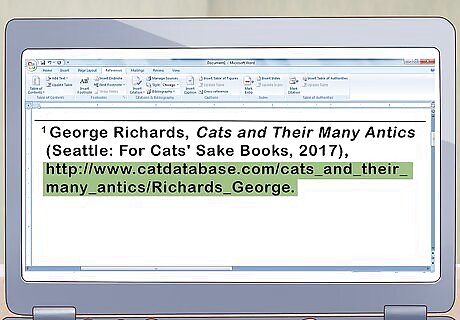 Put the URL or the digital identifier at the end. The URL is just the website address. However, if it's a Kindle book, PDF, ePUB, etc., put that instead. Add a period at the end. For instance, you may write one of the following, depending on what kind of digital book you're citing: George Richards, Cats and Their Many Antics (Seattle: For Cats' Sake Books, 2017), Kindle. George Richards, Cats and Their Many Antics (Seattle: For Cats' Sake Books, 2017), http://www.catdatabase.com/cats_and_their_many_antics/Richards_George. George Richards, Cats and Their Many Antics (Seattle: For Cats' Sake Books, 2017), ePUB. You can also use a DOI (digital object identifier) instead, if the book has one.
