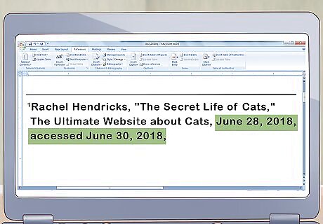 Include the publication date and date accessed next. If you can, provide a publication date for the webpage. You may find it at the top near the title or at the bottom of the page. If not, leave it blank. Write the date you accessed the website either way. For instance, your example might look like this: Rachel Hendricks, "The Secret Life of Cats," The Ultimate Website about Cats, June 28, 2018, accessed June 30, 2018, If it doesn't have a publication date, write: Rachel Hendricks, "The Secret Life of Cats," The Ultimate Website about Cats, accessed June 30, 2018,