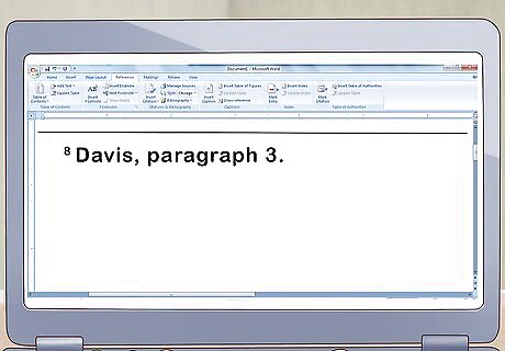 Make a shorter footnote when you use the source again. For a shorter footnote, use the author's last name, plus the page, section, paragraph, or chapter number if applicable. If you're using more than one work by the same author, add a shorter form of the title, too. For instance, you might write: Davis, paragraph 3. If you have more than one work by one author, write: Davis, "Will of My Cat," paragraph 3.