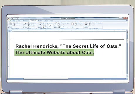 Place the name of the website or organization next. Do not use italics or quotation marks for the website name. The one exception to this rule is to use italics if the website has a print edition that is well-known and came first, such as the Chicago Tribune. Apply headline-style capitalization, which means you capitalize the most important words. Don't capitalize conjunctions, articles, or prepositions unless they are at the beginning or end of the title. As an example, you might write: Rachel Hendricks, "The Secret Life of Cats," The Ultimate Website about Cats,