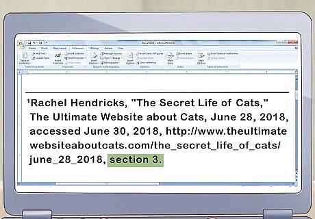Include a section, chapter, or paragraph number if needed. Most websites don't have page numbers, so it can be difficult for your reader to find the section you're referring to. Adding a section, chapter, or paragraph number at the end makes it easier, but it's not a requirement. For instance, you might write: Rachel Hendricks, "The Secret Life of Cats," The Ultimate Website about Cats, June 28, 2018, accessed June 30, 2018, http://www.theultimatewebsiteaboutcats.com/the_secret_life_of_cats/june_28_2018, section 3. Put a period at the end of the citation, whether you end at the URL or a section/chapter/paragraph number.