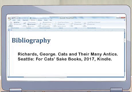 Create your bibliographical entry. Start by reversing the author's last name, and then change the commas to periods. Take out the parentheses, and put a period after the book's title. Leave off the page number or section number. Your final entry should look like this: Richards, George. Cats and Their Many Antics. Seattle: For Cats' Sake Books, 2017, Kindle.