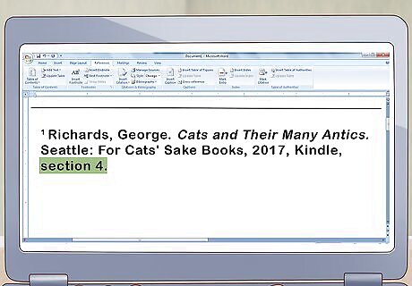 Add a paragraph, section, or chapter number at the end as needed. Electronic books may not have stable page numbers. If they do, add a comma and the page number or numbers. If they don't, you can use a paragraph, section, or chapter number to help the reader find the information, but it's not a requirement. For example, your citation might look this way with a page number: Richards, George. Cats and Their Many Antics. Seattle: For Cats' Sake Books, 2017, Kindle, 245. However, you can also do it this way: Richards, George. Cats and Their Many Antics. Seattle: For Cats' Sake Books, 2017, Kindle, section 4.