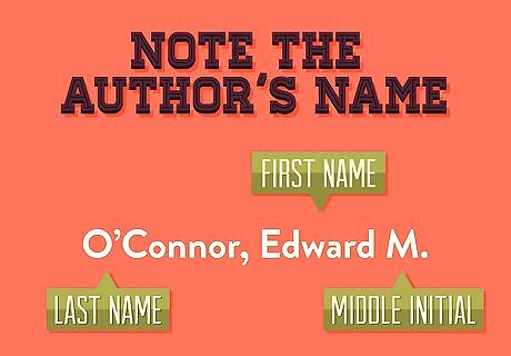 Note the author’s name. The first entry of your published material citation is the author’s name. This gives the author credit for the work while helping your reader more quickly locate the source if she chooses. Write the author's last name, first name, and then middle initial. If there is no author that you can find, write “anonymous” or “author unknown.” For example: O’Connor, Edward M.