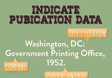 Indicate publication data. The fourth item of information in a published primary citation is the publication data. This ascribes credit to the proper company or body, and may help you or other readers obtain a copy of the source. Record the publication city, publishing company, and copyright date. This information is generally located in places such as the inside cover of manuscripts, the back of photographs, or the box of films. You may not be able to locate this information. In this case, note as much publication information as you can. For example: O’Connor, Edward M. The Final Report of the United States Displaced Persons Commission. Manuscript. Washington, DC: Government Printing Office, 1952.