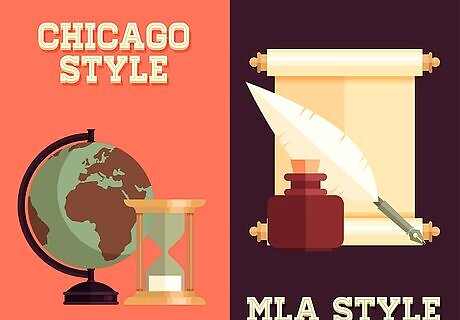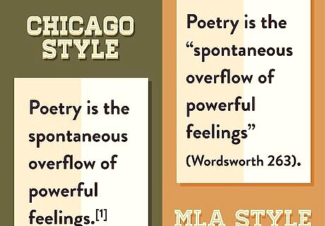 Create in-text citations. In addition to creating a bibliography of references at the end of your text, you will usually need to cite your primary sources as you go. There are different ways of doing in-text citations, depending on the style guide you use. Chicago style does not generally use parentheses to mark in-text citations. Instead, you place a superscript number after your reference to indicate a footnote or endnote, like so: "In Chicago style, use a superscript number to indicate a citation." For Chicago style, you list the full reference in the footnote. MLA style uses parenthetical citation to cite sources within texts. In most cases, you will use the author's last name and the page number. You can cite the author's name in the actual sentence, followed by a parenthetical citation: According to Wordsworth, poetry expresses "the spontaneous overflow of powerful feelings" (263). You can cite the author's name and page number in the parenthetical: Poetry is the "spontaneous overflow of powerful feelings" (Wordsworth 263).